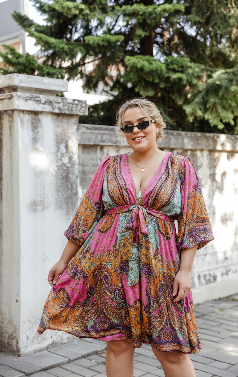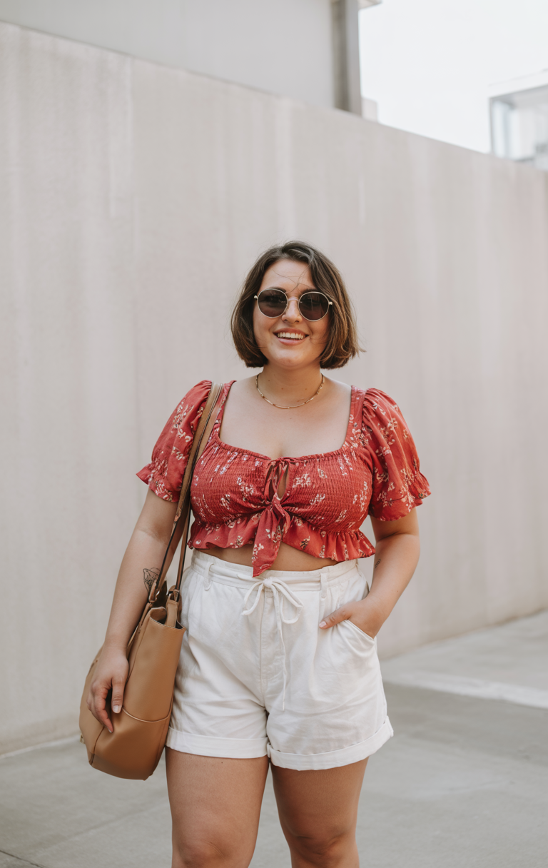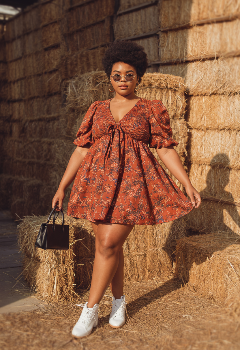 This babydoll dress shows off its charm in rust tones while maintaining its light fabric and floral design, making it ideal for summer outfits. A ruched bodice with a tie detail at the front creates an attractive shape and the puff sleeves add a romantic appeal. The outfit combines casual charm with white ankle boots and a black handbag, while adding a playful edge. Summer 2025 outfit design for plus size women presents this ensemble that achieves the look of soft elegance while maintaining boldness.