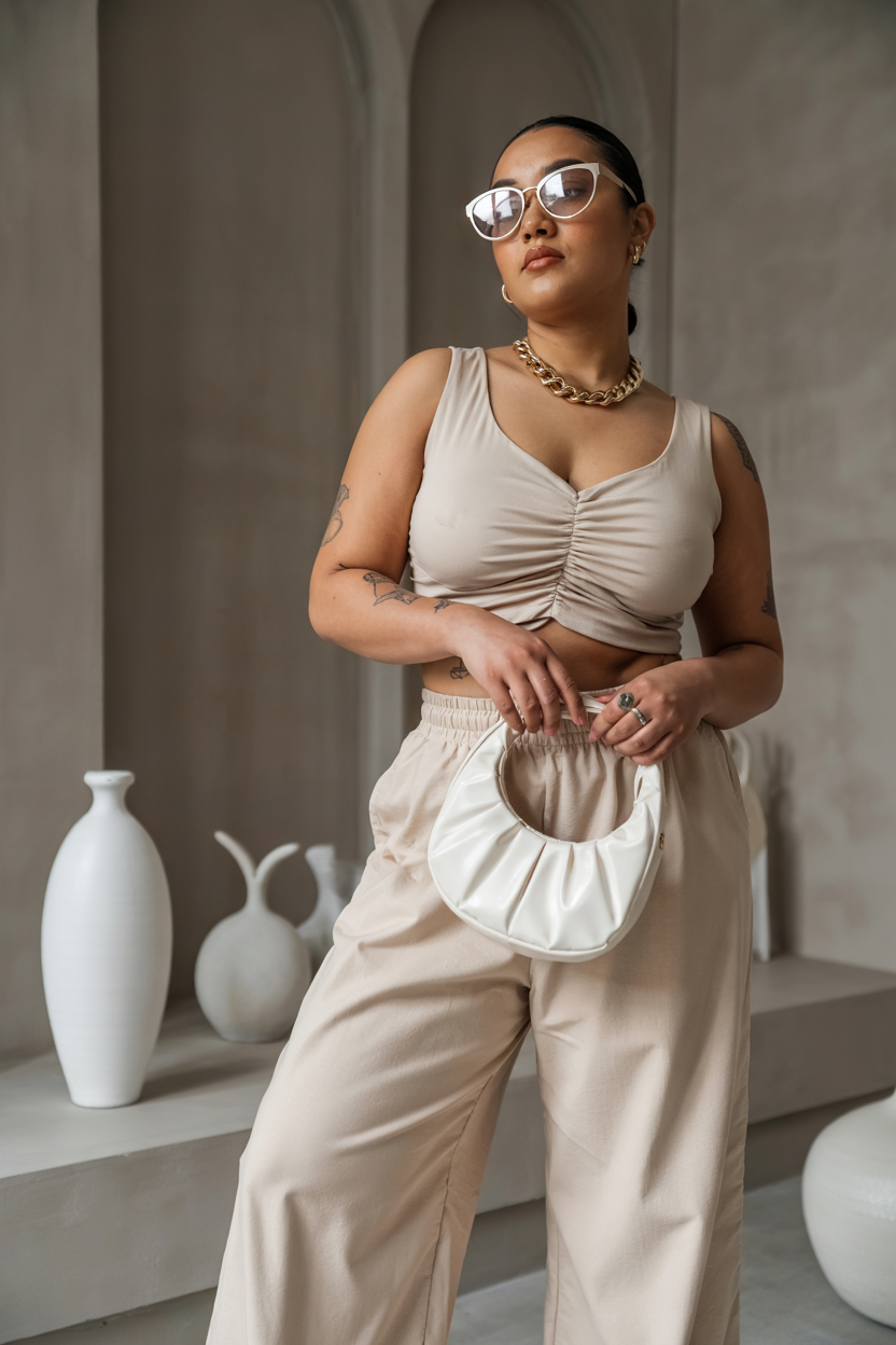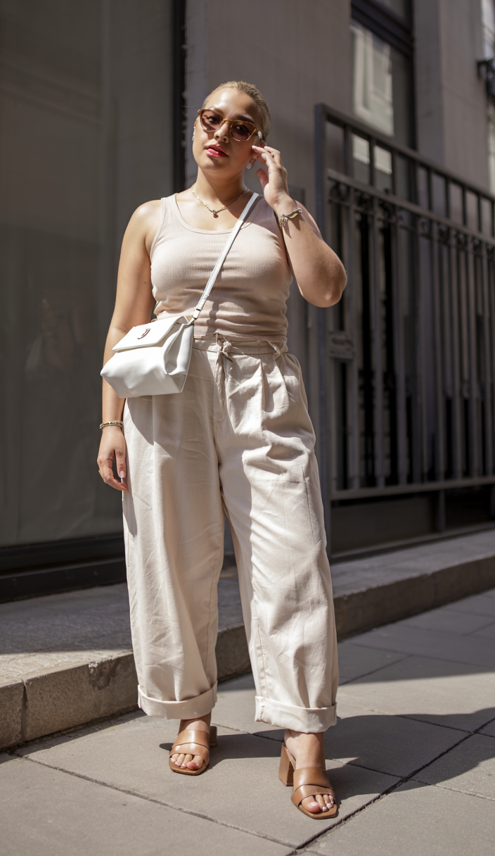 A well-balanced outfit consists of a fitted ribbed tank that tucks into paper bag pants with a high elastic waist. The tailored roll design and lightweight construction create a relaxed effect that works well in hot city conditions or during the day. The outfit achieves a European-inspired casual simple casual chic style when paired with block sandals and a crossbody bag. Another standout in this summer 2025 plus size outfit ideas for women collection.