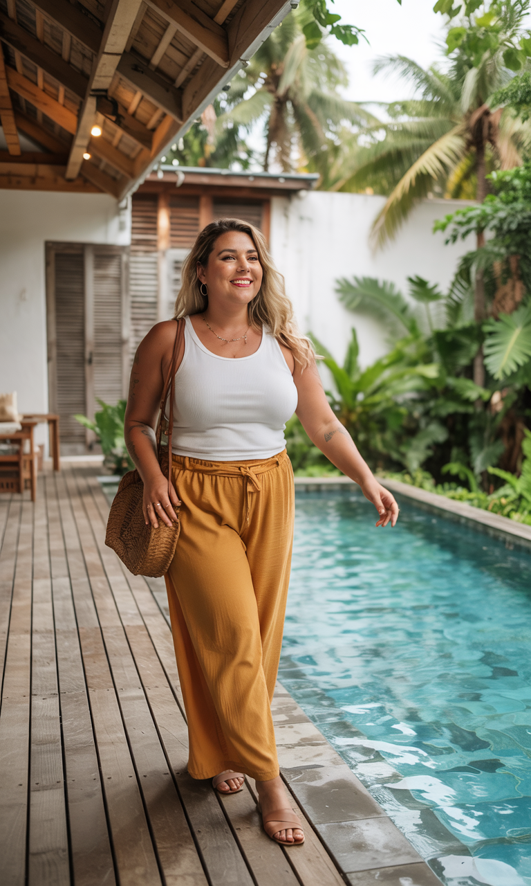 A white tank top with classic design points is paired with mustard pants that maintain a soft, breezy style. These warm colors project a 2025 aesthetic through the appropriate hot weather elements of this combination. The casual, simple look is finished off with simple accessories. Wear this outfit as it will effortlessly transition from the oceanfront to breakfast.