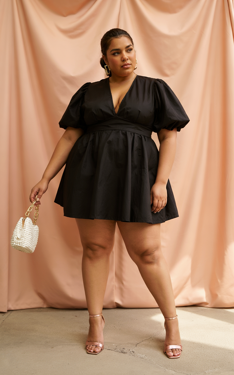 The black mini dress keeps its basic shape simple while its oversized sleeves create a dramatic effect. The coverage is modest, but its fashion is cute, making it suitable for summer occasions. The fabric retains a textured shape that contributes to its soft and defined look. A timeless piece among the Summer 2025 plus size outfit ideas for women.