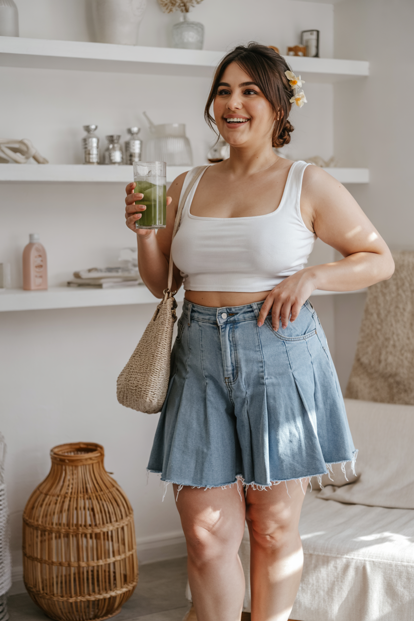 This style features an innovative cut of denim shorts paired with a white, body-hugging tank top. The outfit has a street-style casual feel, while belonging to the modern-classy trends that represent personal character. This outfit works well for outdoor summer trips and visits to urban areas. The outfit has a 2025 modern vibe.