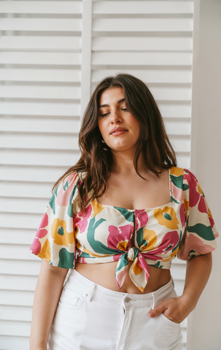 The blouse has a tie front design that goes well with summer pants that have a high waist. The simple design enhances the look as it has features to make its own statement. This outfit works for errands as well as casual work environments. Your collection of summer 2025 plus size women’s outfits will get an effortless touch with this addition.