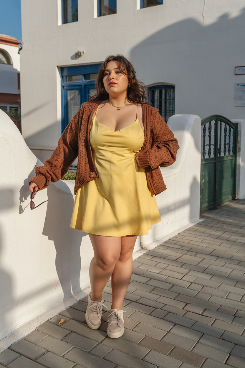 The sunny yellow slip dress is an excellent choice for a summer afternoon. The outfit combines effortless simplicity with casual work style as the yellow slip dress is balanced by the brown knit cardigan. The combination of sneakers and a minimalist necklace creates an aesthetic outfit by Shein that provides comfort while standing out. The outfit works well for exploring the city or for a leisurely lunch in York.