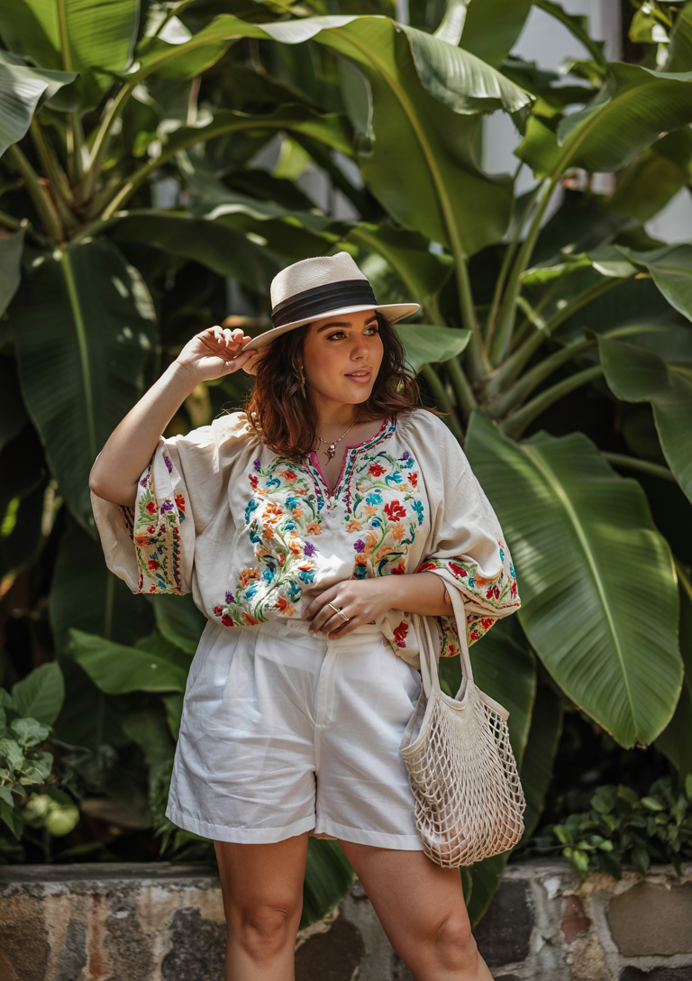 The harmonious combination of a cream embroidered blouse paired with airy, casual shorts creates an aesthetic and breezy look. Details on the top include vibrant florals and wide sleeves in a loose fit that works well in warm weather. The white high-waisted shorts offer a simple modesty that works for both market shopping and beachfront dining. The updated simple casual wardrobe calls for this item in 2025.