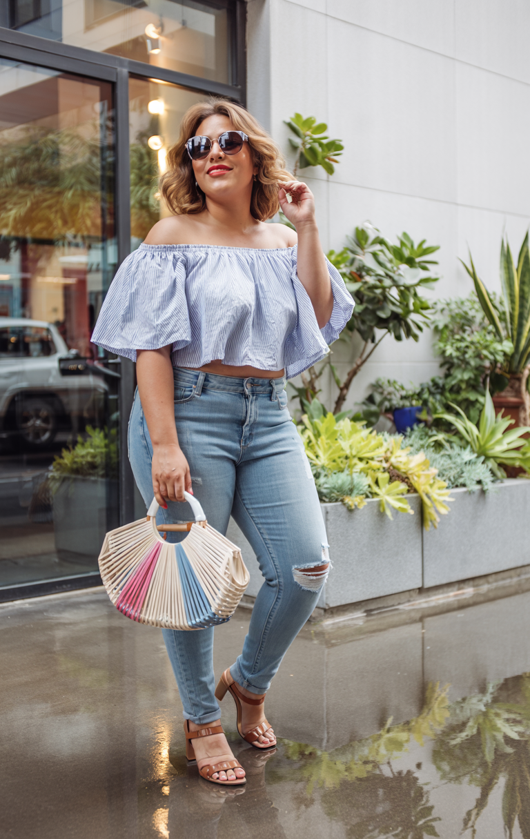 #22 Striped Off-Shoulder Top and Distressed Skinny Jeans