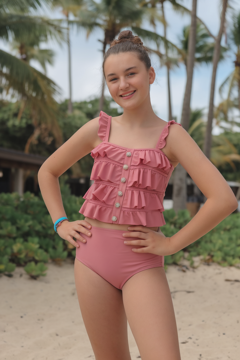 #15 Pink Ruffled Two-Piece Swimsuit with Button Details
