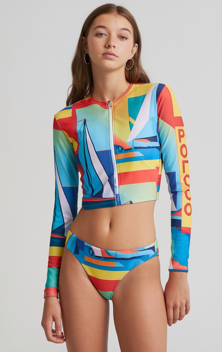 Emphasising every edge of your body, the two-piece swimsuit set captivates attention with sassy color block shaping. The matching bikini bottoms abstract the energetic bold hyper geometric design, allowing movement in sassy style. The fitted wahs seated is also cropped so that flattering bold rashes take the center stage. Perfect mix of protection and style focused swim currently on trend.