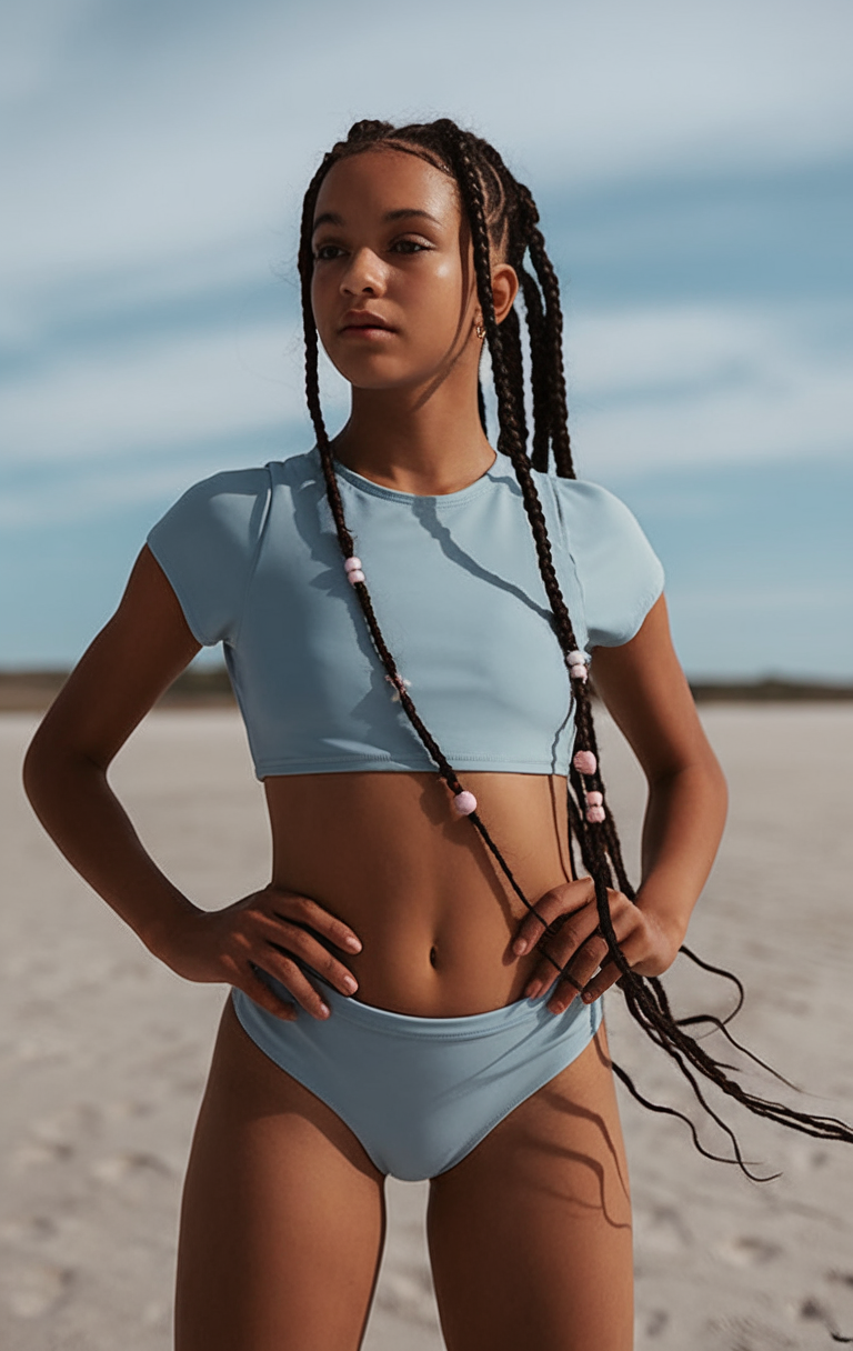 This two-piece swimsuit features a clean crop top style swimsuit with short sleeves and simplistic blue design aimed for the stylish summer of 2025. The matching bikini bottoms are simply seamless which pairs perfectly with the top. Great for summer, this swimsuit is geared towards individuals who appreciate a more minimalist aesthetic approach to their designs.