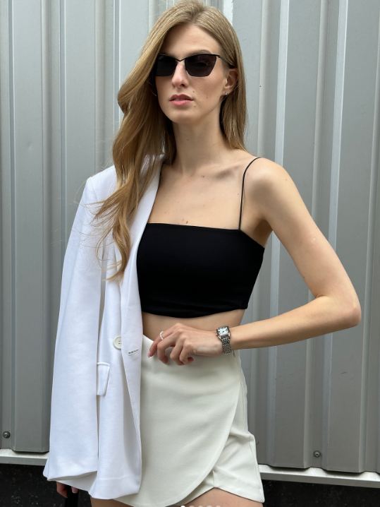 There’s something about sharp contrast in summer that just hits differently. A crisp White blazer thrown over a sleek Black crop top instantly creates that effortless Chic balance between polished and undone. Paired with a light mini skirt in a soft neutral tone, the whole look leans into that refined Women street styles energy while still feeling breathable and easy.