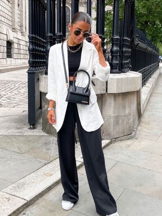 Sometimes the easiest way to look put together is to stop overthinking it and lean into contrast. A lightweight White blazer layered over an all Black base instantly creates that clean, graphic look that defines modern Women street styles. Wide-leg trousers add movement and comfort, while the cropped top keeps it fresh and perfectly aligned with summer blazer outfits 2026.