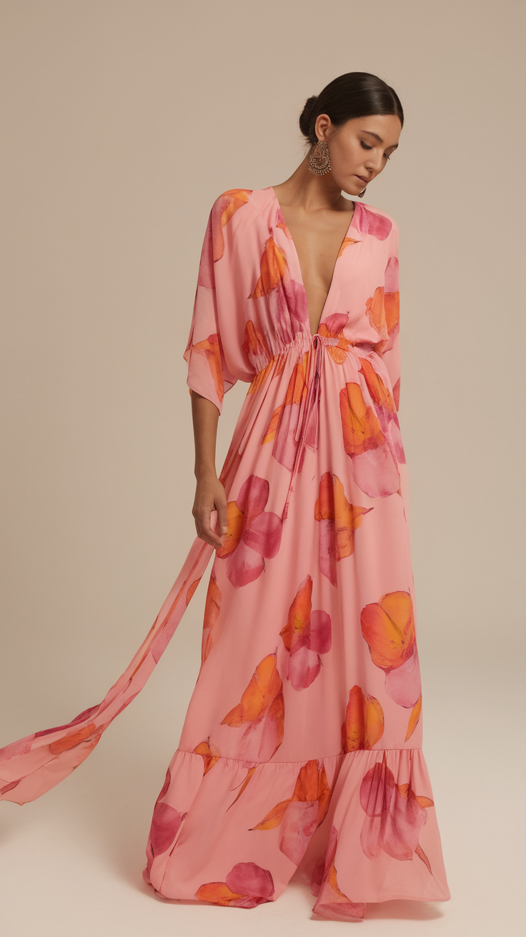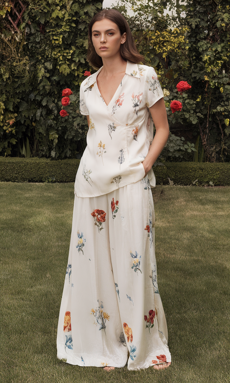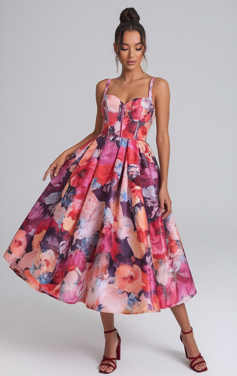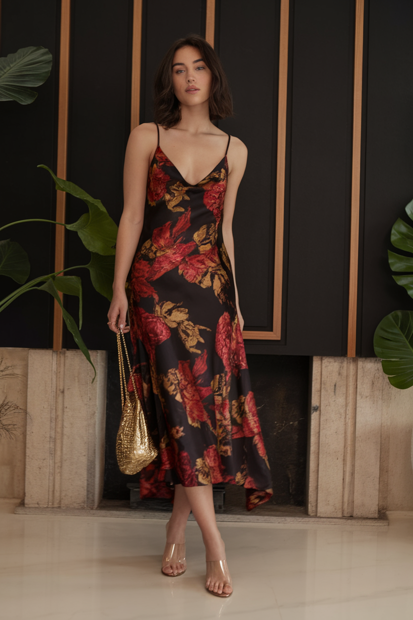 The dress bears a resemblance to silky period lingerie with its understated belle form and deeply flaunting bottom, retaining the bravado of satin clothing with its linear flowers designed in order of red and golden colors. The darker shades provide an atmospheric charm ideal for a resourceful dimly lit evening romantic dinner, bush wedding, or even for those type of indoor events aspiring to channel Eden. It gives a touch of quiet drama and luxury with the freedom-enhancing flowing cut that intensifies every movement. Surely a compelling option among the Summer garden Party Outfit Ideas 2025 for the modern effortless glamour women.