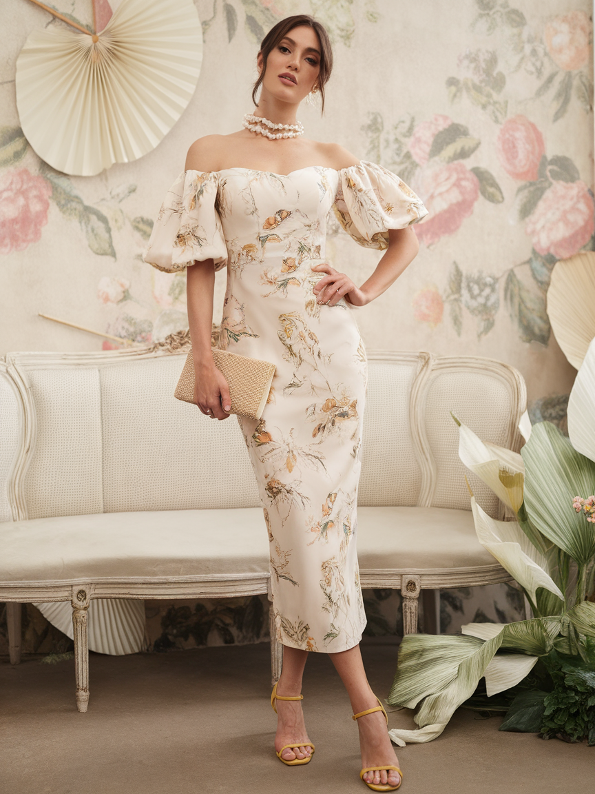 Textile with a floral bird print design creates this frock, with full puff sleeves and an off-the-shoulder neckline. The faded cream color combined with the vintage style print further accentuates its suitability for formal garden weddings or dinners. Refined detailing in the dress evokes a sense of a bygone nostalgic era which is most perfect for an enchanted venue. A graceful option for stylish women romantic in nature.