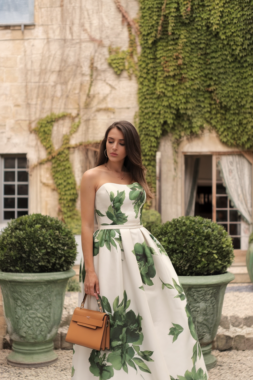 The strapless dress has a structured bodice which fits into a voluminous A-line skirt overskirt that has an enormous leafy print in rich olive undertones. The clean ivory base balances out the natural elements which makes this gown perfect for an elegant wedding, luxury photoshoot, or botanical gala. This gown captures the essence of timeless romance while being fresh, rooted, and grounded. The refined Eden inspired option for 2025’s Summer garden party outfit ideas.