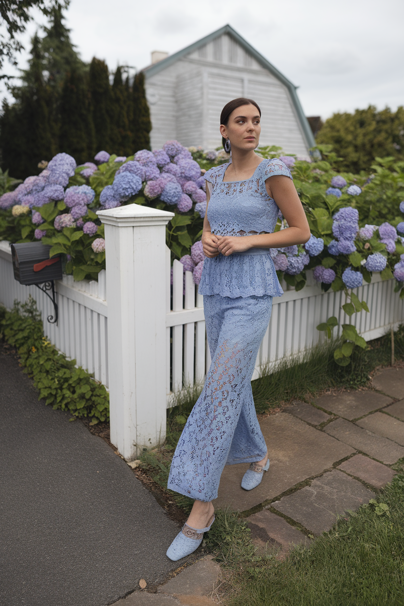 This beautiful and delicate set consist of a cap sleeve lace top with scalloped hem and wide leg lace trousers in a soft pastel color. The floral lace print gives an elegant and vintage feel which combines nicely with a blooming bush or quaint park for a spring photoshoot. This set is the right balance between feminine and comfortable, a fresh approach to polished casuals. A soft feminine option for graceful women who want a relaxed look.