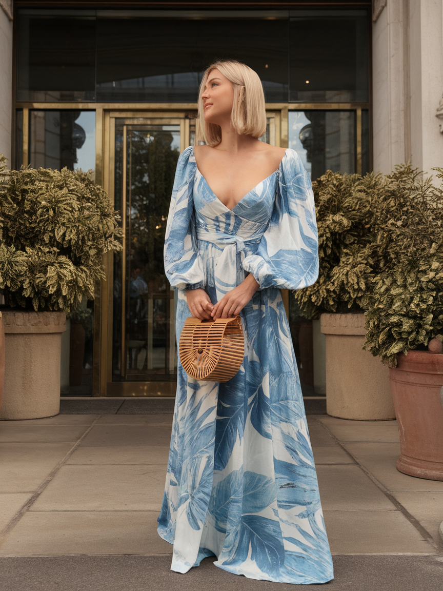 #5 Blue Leaf Design Puff Sleeve Maxi Dress
