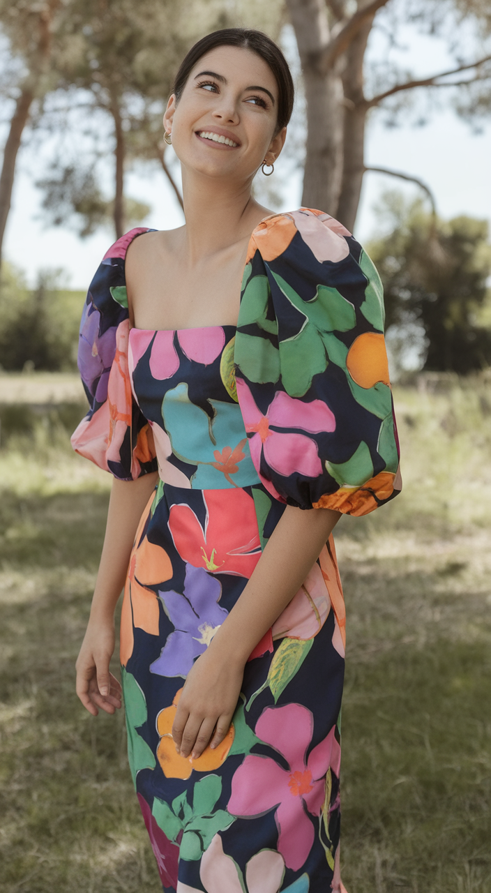 #3 The Dress with Bold Multicolor Florals and Puffed Sleeves