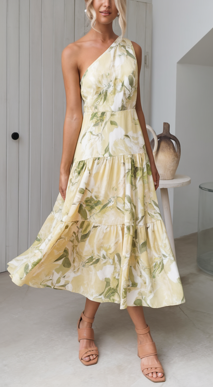 #22 One-Shoulder Yellow Dress with Soft Green Floral Designs