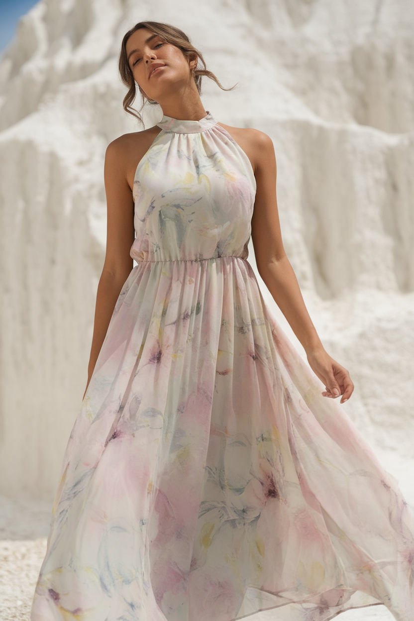 #17 Soft Brushstroke Floral Pink Halter Dress
