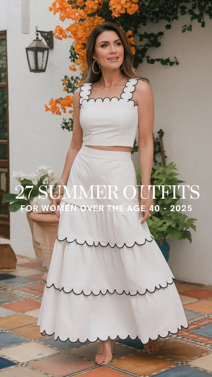 The two-piece set is reminiscent of 2025 styles while retaining a classic. The white crop top has wide scalloped black straps that go perfectly with the full tiered skirt that has black accents. The skirt is high waisted which gives a flattering fit for mid-sized women and is good for warm occasions. The outfit is completed with delicate strappy sandals which gives a sophisticated easiness to summer dressing for women above 40 in 2025.