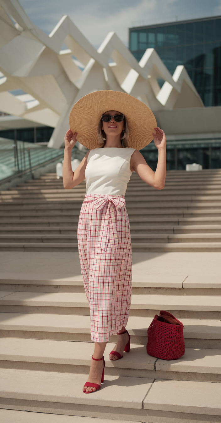 This smart casual look combines a structured white sleeveless top and a high waisted, plaid wrap skirt. The pink and red color scheme of the skirt softens the look, while the belt further enhances the waistline. The Western inspired look is rounded out with a wide brim straw hat and bold red heels which is on trend for 2025. This outfit works well for a day in the city or on the boat and stands out against other combinations of smart casual summer outfits.