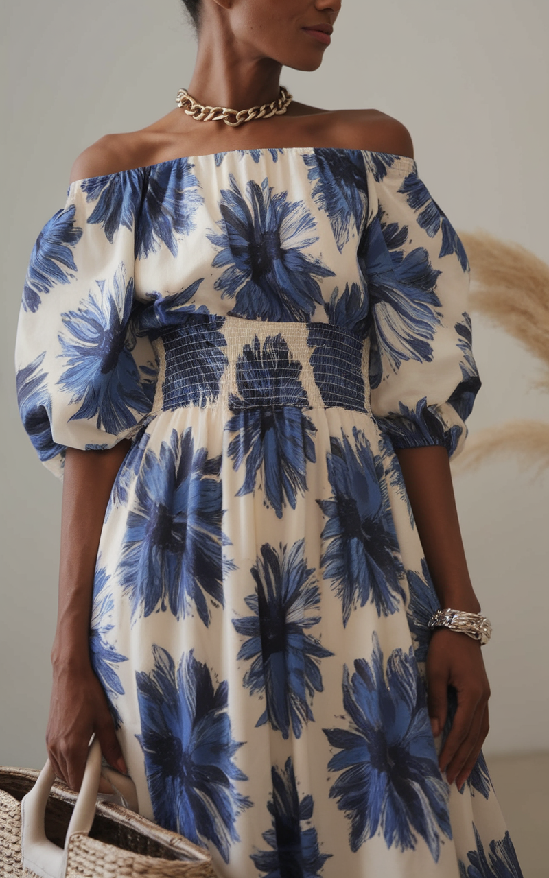 The on-and-off the shoulder maxi dress is beautifully off-the-shoulder with bold floral blue flowers printed on a white dress. Puff sleeves with smocked waist details provide a several size range, with the waistline offering a bit of stretch above. Accessories with gold necklaces and chunky earrings while carrying a bag grant this outfit an amazing touch of elegance and casual wear. This dress also becomes one of the dresses that stand out in the 2025 fashion trends whether as a hijab-friendly covering or an easy going relaxing day dress.