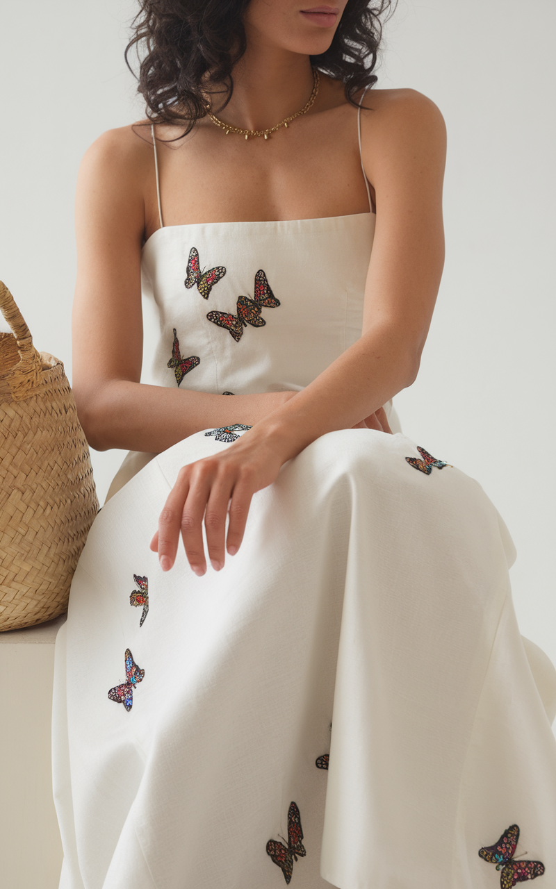 The delicate embroidery of butterflies on a structured white dress transforms the smart casual dress into an exquisitely trendy outfit. The minimalistic dress sprouts out of the elegant bodice, forming an A-shape which flows around the body, perfect for every feminine classic. The woven bag styled with the dress adds an elegant component for summer fashion.