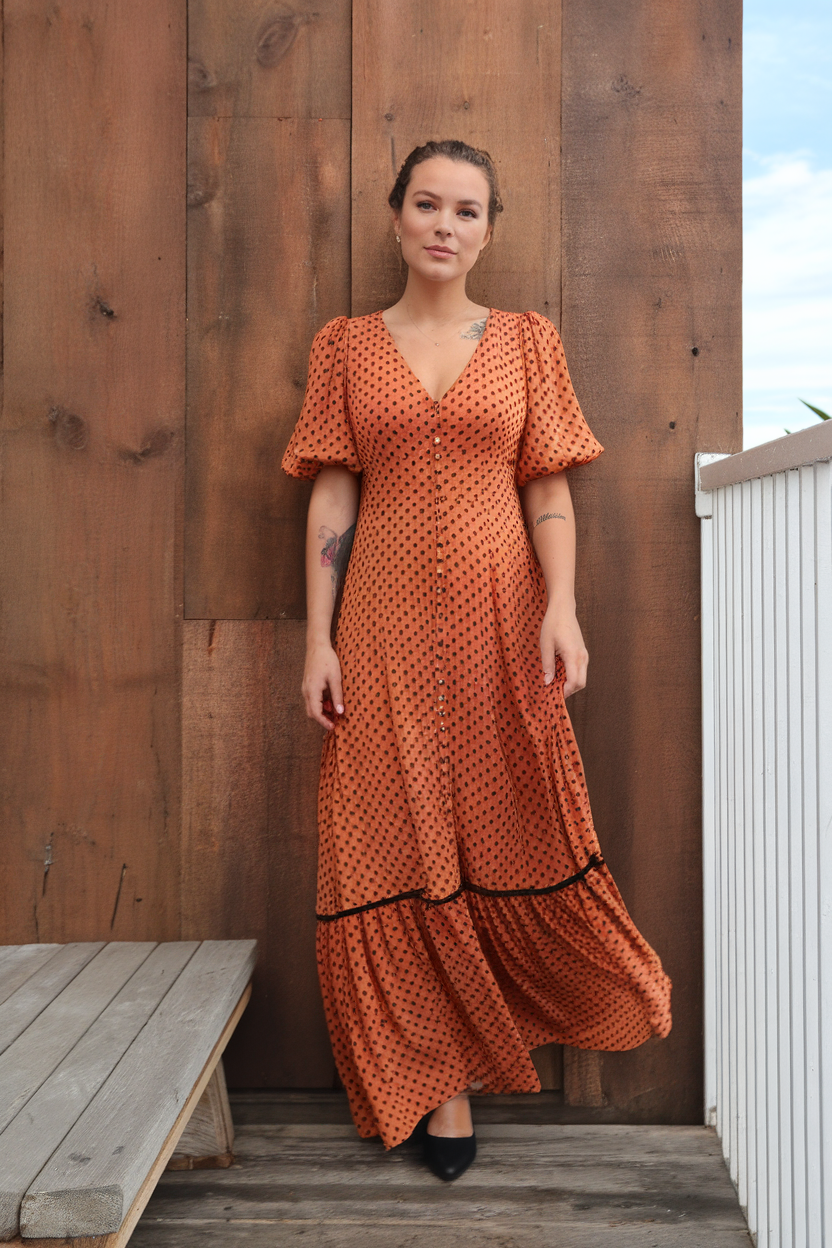 This dress is currently in fashion, and I must say, the Western touch is very well incorporated. The burnt orange color along with the tiny black polka dots makes it very attractive. It has a V-neck shape which gives more definition to the figure. It also comes with puff sleeves and a tiered skirt, which also increases the volume of the dress. The set of buttons on the front serves to make the dress even more appealing from the summer casual elegant dress. It pairs perfectly with the classic black heels, best to wear in the warmer seasons.