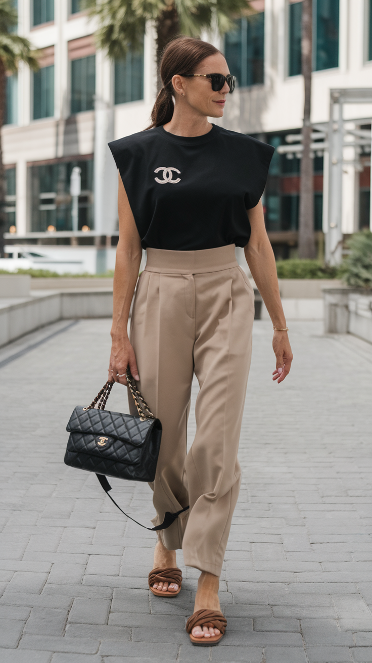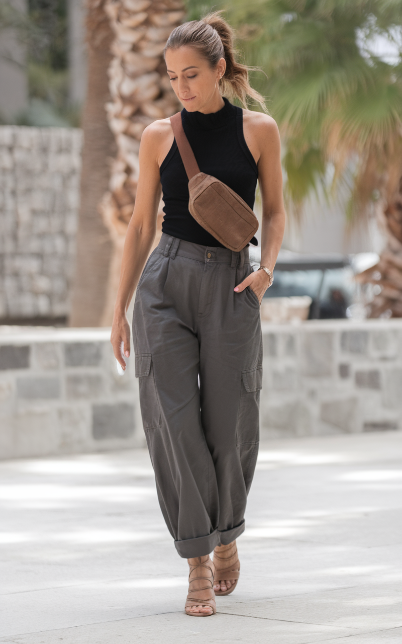 This outfit blends smart casual and casual elegant styles. It consists of fitted black sleeveless top and loose beige trousers. The Western-inspired cargo pants give a stylish utilitarian touch, making it ideal for city or hiking wear. A carefully structured belt bag further enhances the style while maintaining a practical edge, and the delicate strappy heels add a touch of femininity. This outfit serves as a staple for the 2025 fashion trends as it provides both comfort and elegance for summer wear for women over the age of 40.