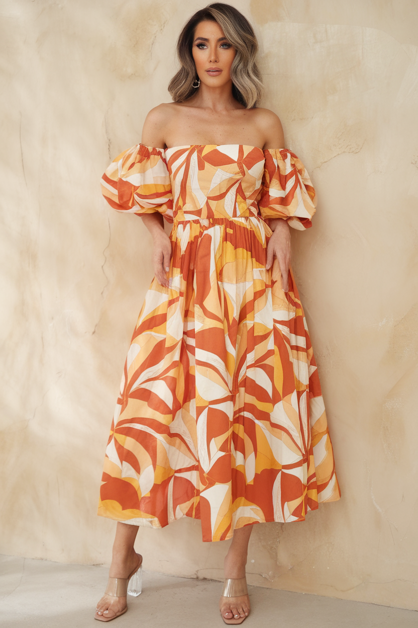 #6 Dramatic Printed Off-Shoulder Maxi Dress