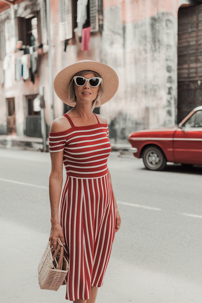 This casual elegant midi dress has some nostalgia with its bold red and white stripes while also looking stylish in the year 2025. It has an off-the-shoulder modern cut that is complemented beautifully by the fitted bodice and flowing skirt, creating a balanced mid-silhouette. This look is completed with a wide straw-brimmed hat, white cat eye sunglasses, and a basket bag, making it perfect for a street style look, or for a relaxed boat outing.