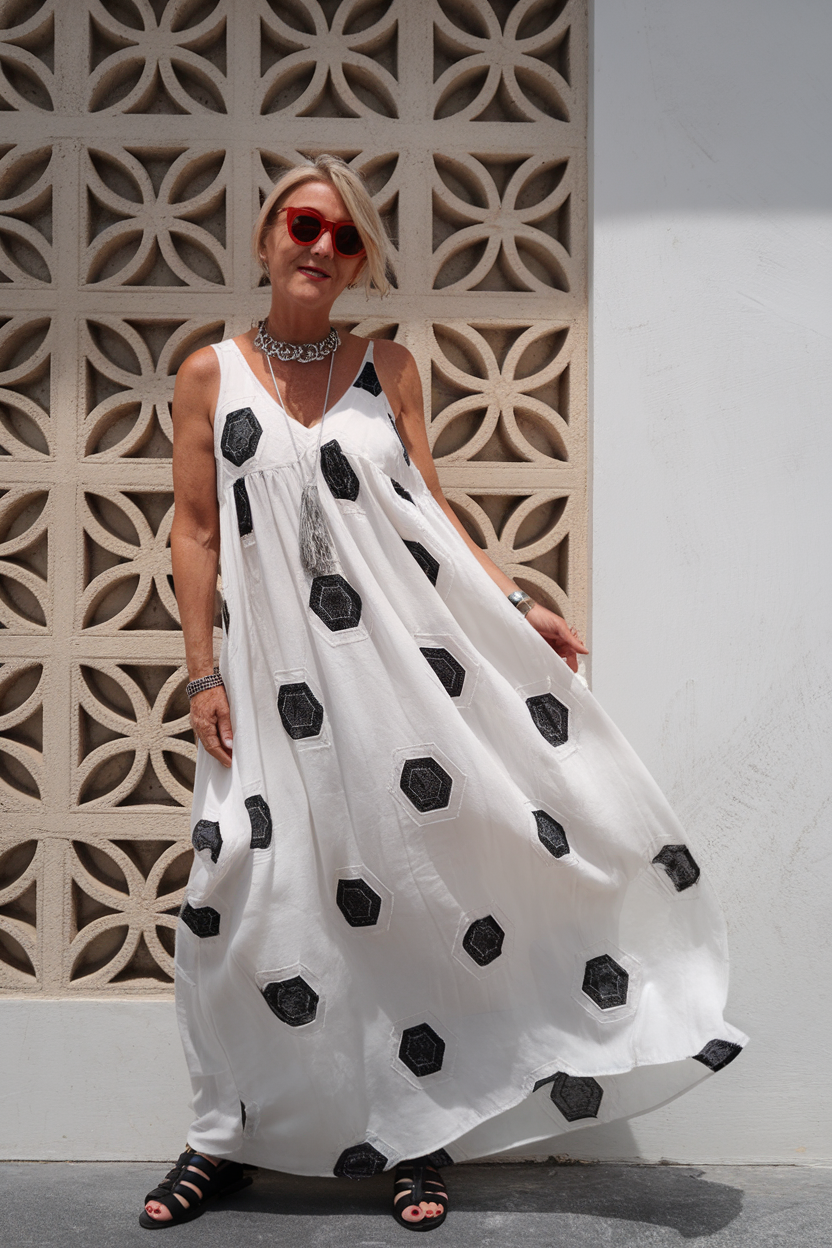 The skirt is fit-and-flare, and this dress captures attitude and ladylike chic. Its square neckline and structured colors, combined with artistic prints establish the contours of a mid-size figure. Pleats on the skirt and bow-tie straps add to this as it infuses movement and flounce. Coupled with other street style elements, this truly depicts casual elegance. Women over 40 love this summer outfit for its boldness which sets it apart from the rest of the dresses in 2025.