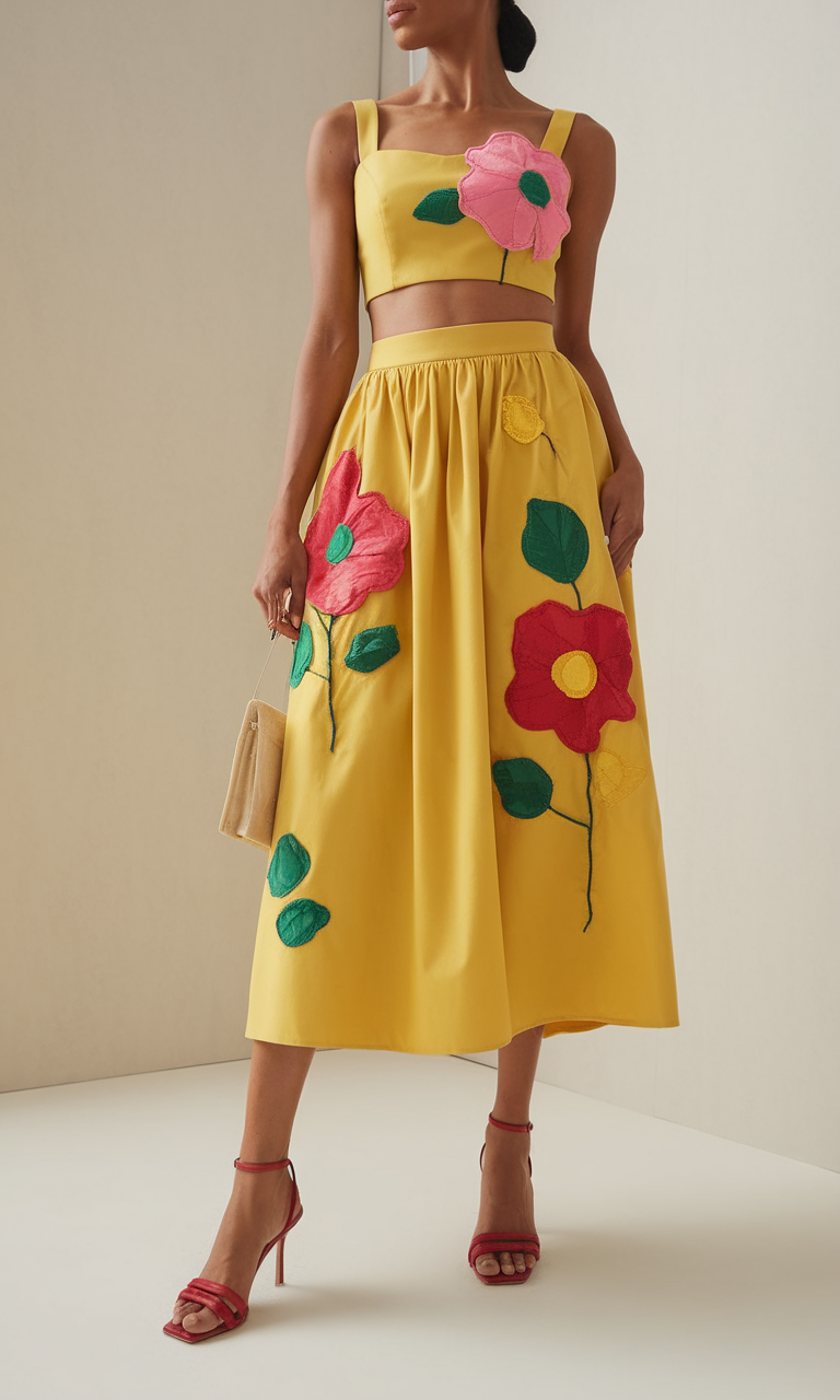 flowing skirt with mid length. The bright yellow color is beautifully decorated with oversized floral appliqués which add texture and three dimensionality. Contrasting the form in the bodice and high waist rule skirt gives an elevated physique adding modern street styles to these red bold heels.