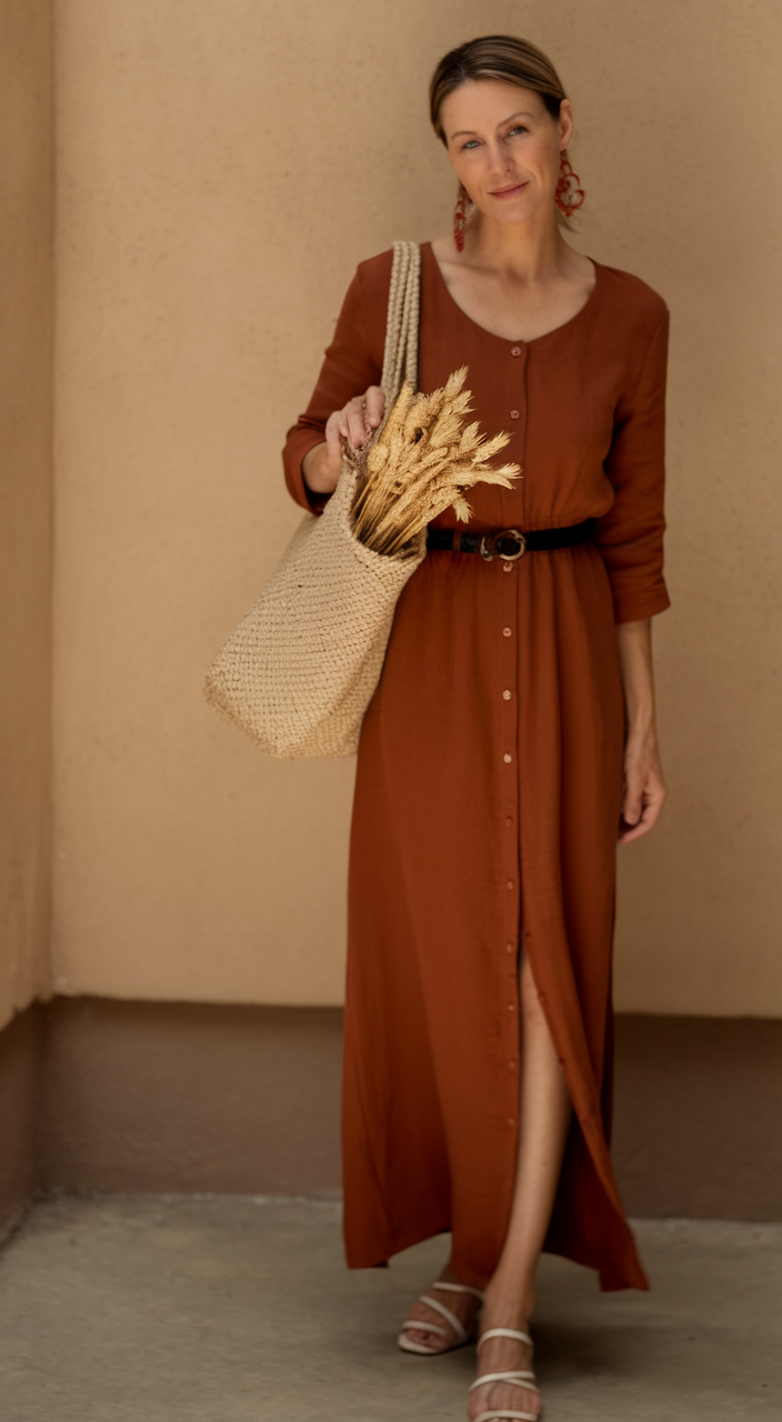 #3 Rust-Toned Buttoned Maxi Dress with Belt
