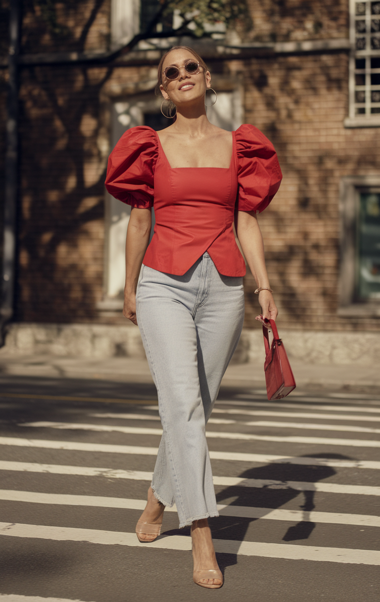 This top red puff-sleeve top cropped jeans style is embroidered with bold and fashionable themes. It is bound to be one of the standout pieces in 2025 trends as its fitted waist and dramatic sleeves draw inspiration from Korean fashion dress casual aesthetics. Grounded by light-wash denim, this outfit exudes effortless chic femininity. Completing the look the modern transparent heels coupled with muted red handbag adds casual chic flair to the outfit.
