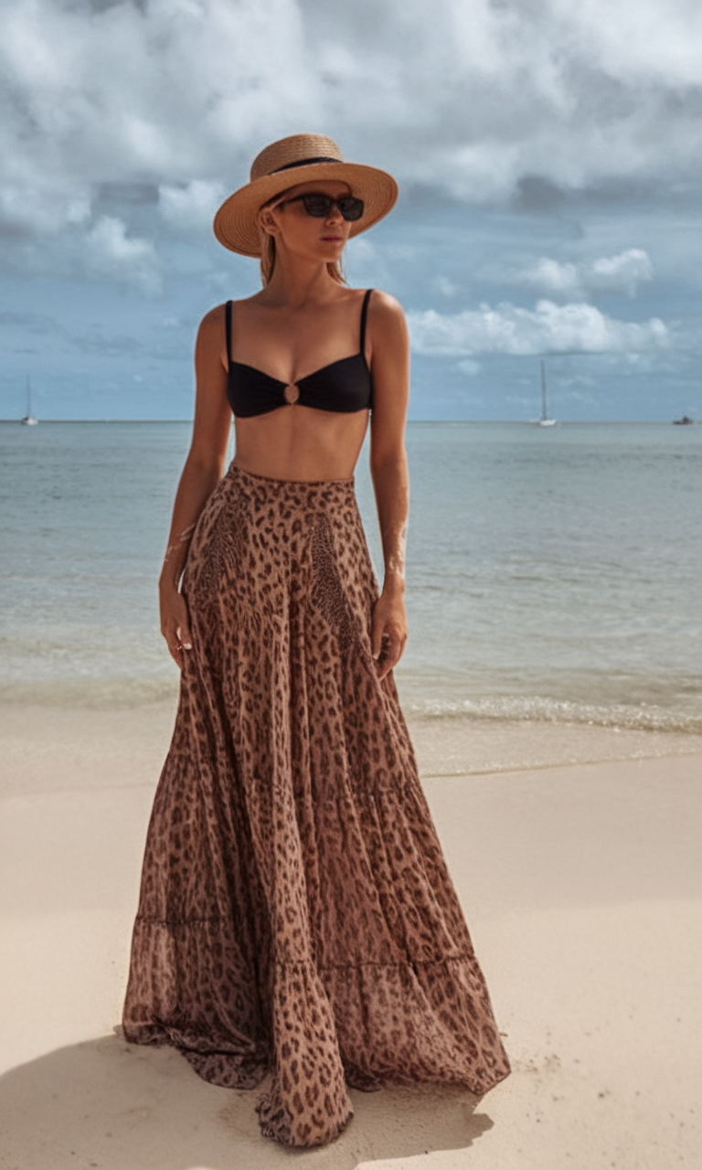 A gorgeous sleek textured black bikini top goes perfectly with a flowy leopard print maxi skirt, making it the ideal chic beach outfit. The elegant skirt is mid waist which allows for drama and movement, and the structured bikini top contrasts it perfectly. The combination is perfect for women who love daring fashion as the mix timeless elegance with trendy wild prints. This style will definitely be spotsed with beach cover ups in 2025.