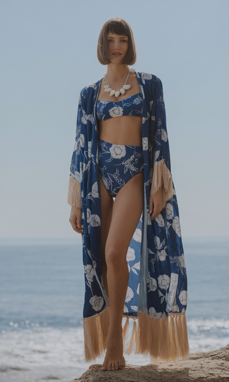 With its exuberant floral embroidery and navy blue fringes, this kimono designed cover up embodies a laidback bohemian fashion style. The matching bikinis go perfectly with the flowing coverup. The light summery fabric makes it an effortless layering piece during hot summer days. This currently hot piece provides a modest, yet stylish vibe to an outfit for summer 2025.