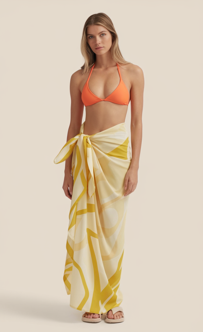 This bold orange triangle bikini top is a perfect match for my flowing yellow sarong. The light cover up skirt features an abstract collage print which is fun and exciting. The wrap style skirt is adjustable for different size fits. This cute piece is ideal for summer 2025.