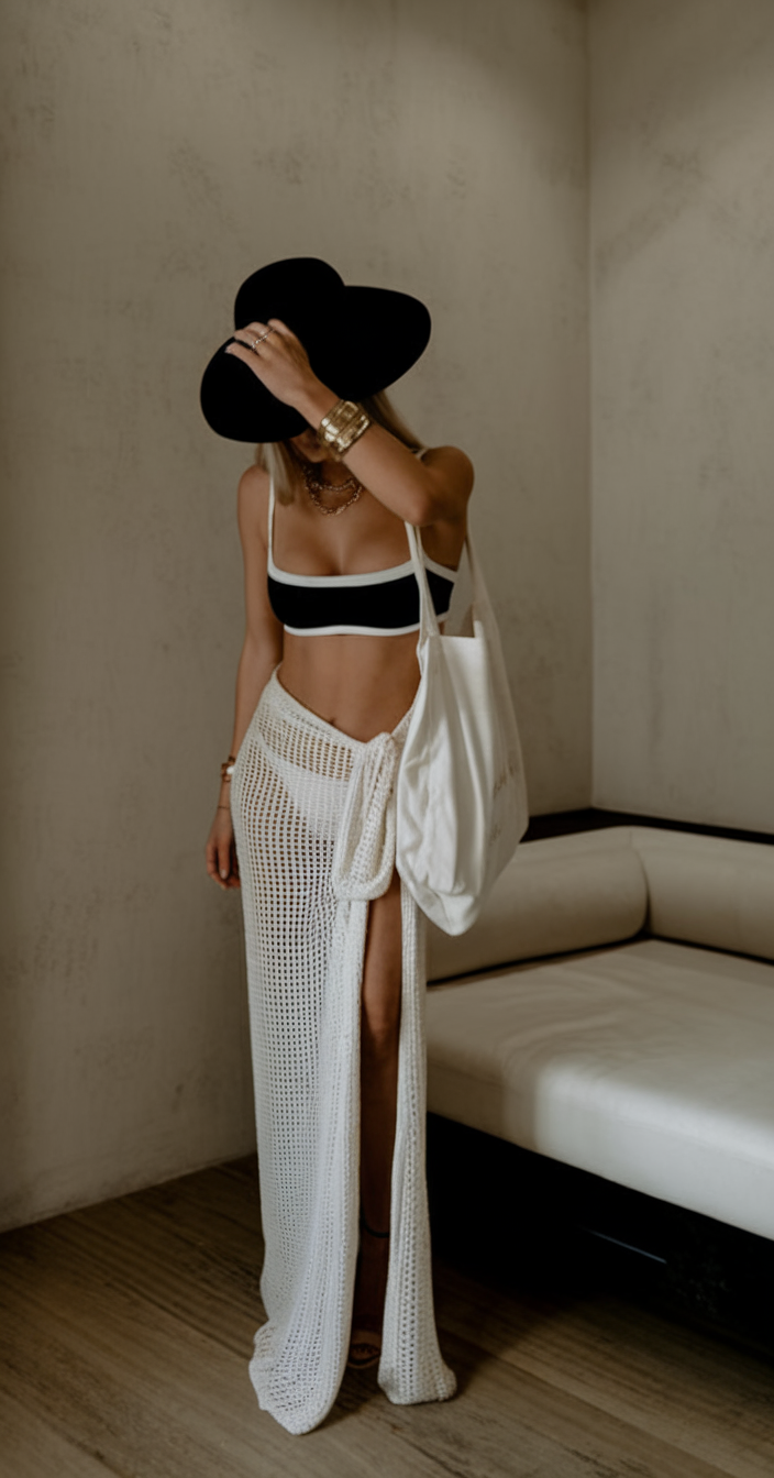 A black bandeau bikini matches beautifully with a white crochet maxi skirt, creating a striking contrast. The cover up has an open knit texture that has a high slit which adds style. This piece is stylish while also being functional because it is cute and very breezy to wear. Perfect for the 2025 beachwear fashions.
