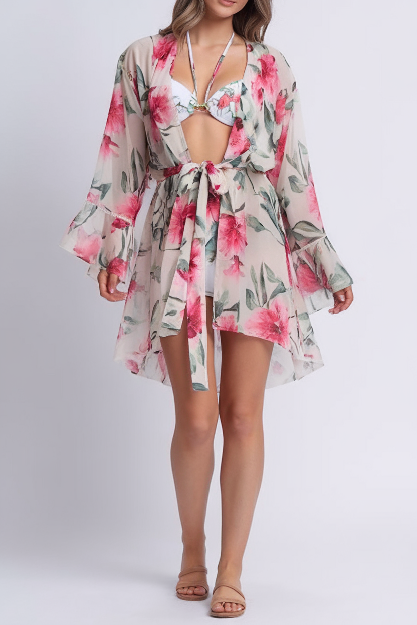 #1 A Romantic Beach Look with a Floral Sheer Kimono Dress