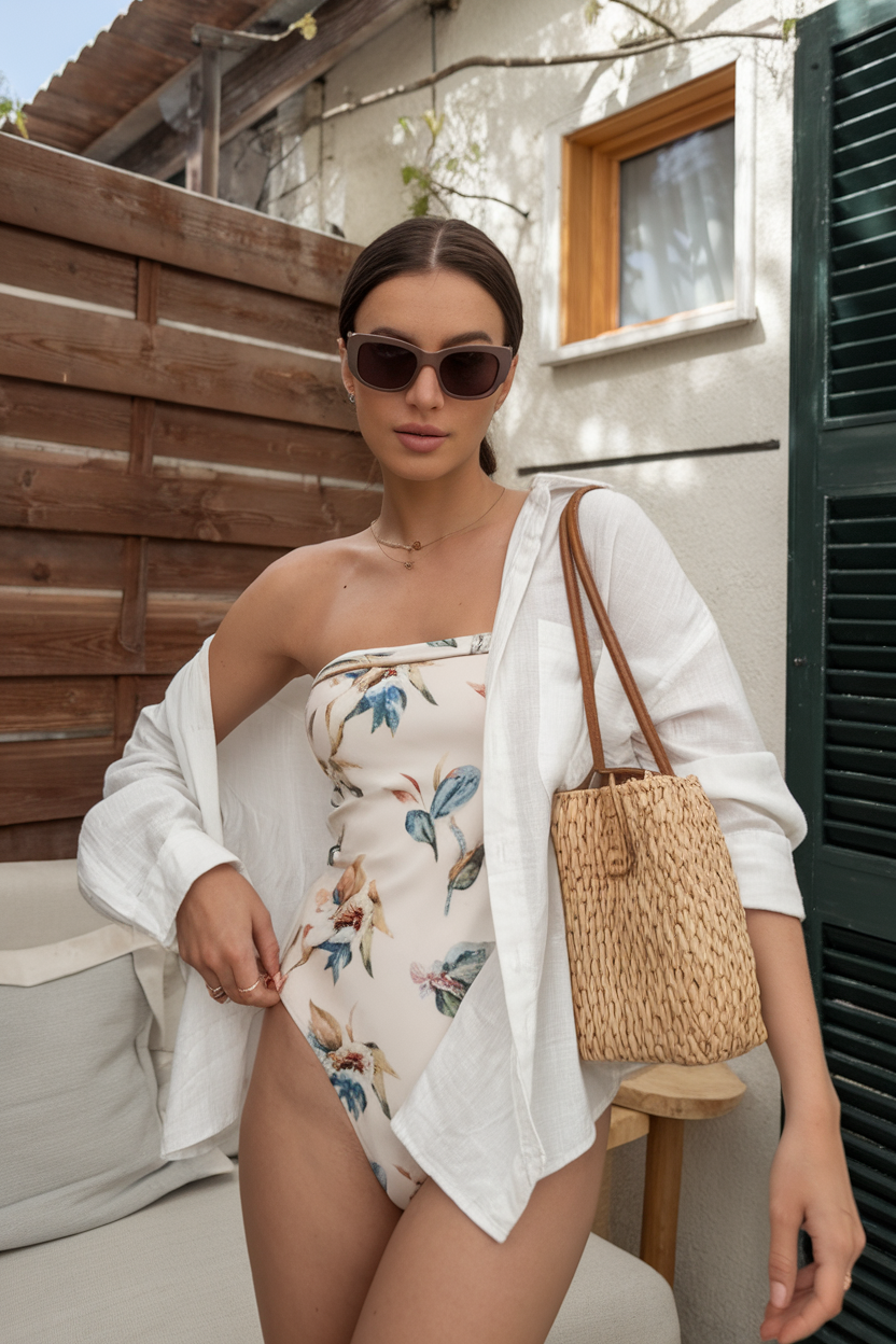 The sleek one-shoulder white bodysuit serves as an anchor for the rest of the beach-ready outfit. Together with the high-slit printed cover up wrap skirt, this look achieves the desired structure and flow. The rich earthy hues of the skirt provides sophistication with a warm touch, making it a great option for 2025. This piece is tailored for those looking for a modest yet stylish beach look.