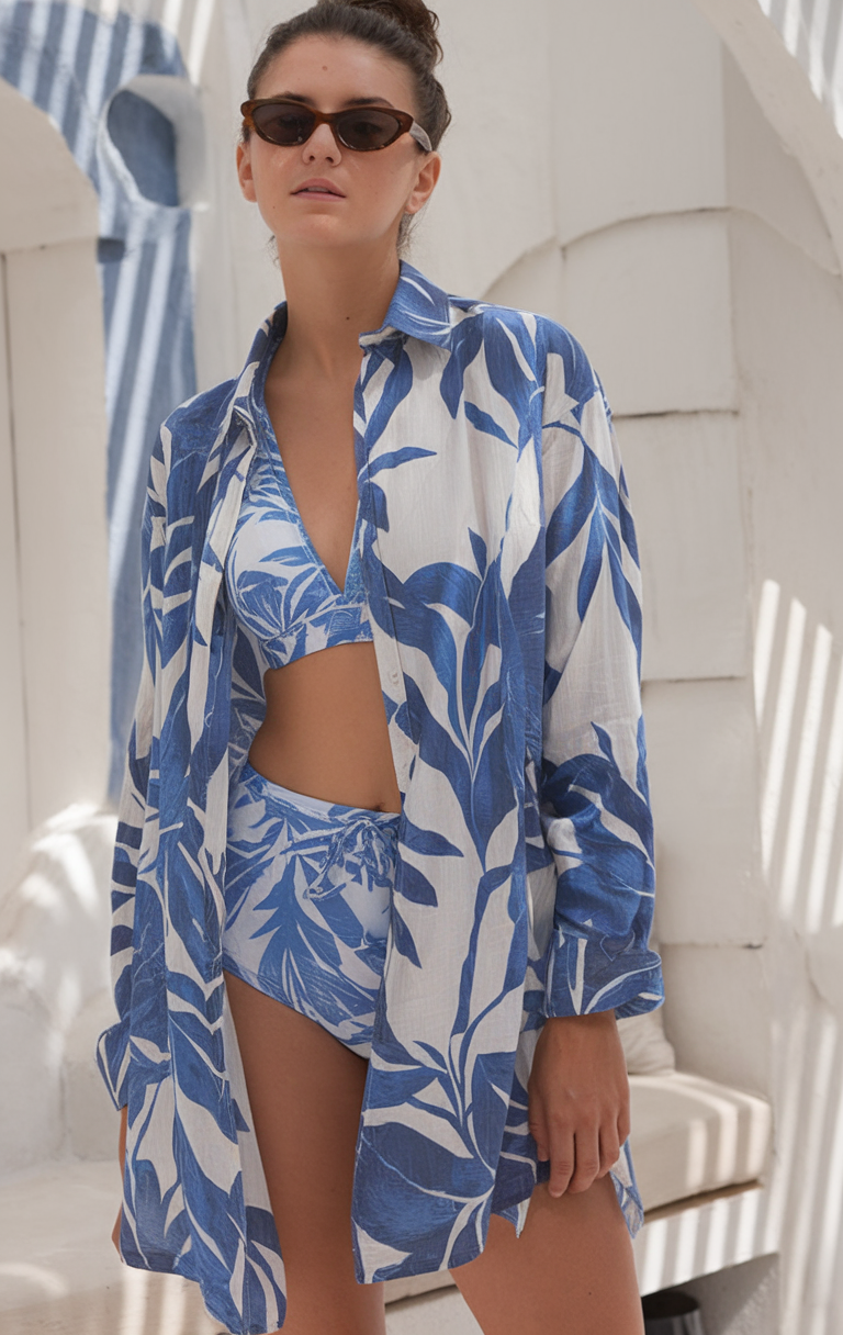 This oversized white and blue shirt is enhanced with bold tropical prints, making it extremely stylish . The shirt is ideal for layering over swimsuits due to its lightweight and flowy nature. The oversized fit offers a subtle blend of comfort and style, making it ideal for the summer time. With the right minimalistic approach, these trends can be incorporated easily into casual beach outfit ideas.
