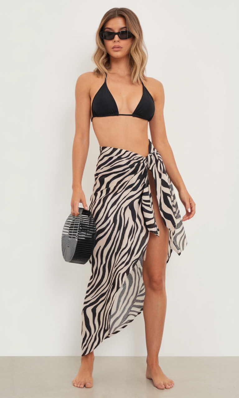 This tie-front zebra print bikini paired with a sarong cover up will definitely make the waves at the beach. The lightweight covering skirt is easy to wrap, and can be tossed on over a bikini making it a perfect layering piece. The high slit leaves plenty of room for fun and keeps the outfit stylish while looking effortless. Great for those who love matching modern looking swimsuits in 2025.