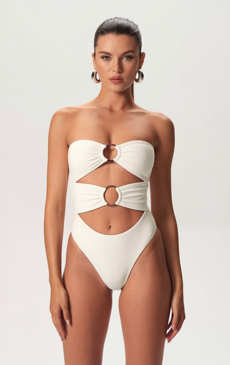 Cut-outs are super trendy and great for modern swimsuits looks for 2025. This one goes even further thanks to the two circular rings that serve as bold accents. The bandeau top paired with the high-leg cut creates a sleek feminine silhouette which is even more accentuated by the clean minimal aesthetic. Uninhibited design gives the freedom to style it with numerous beach accessories. Perfect for women who love statement pieces.