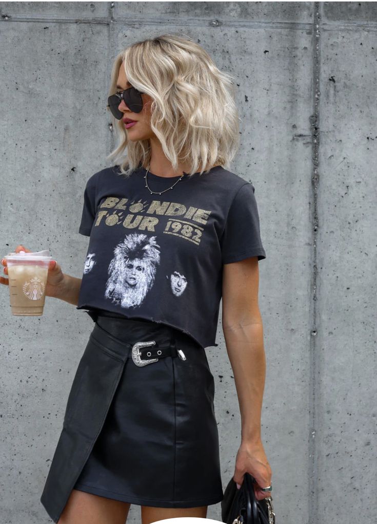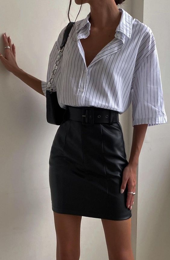 The black leather skirt has made a bold return, channeling the spirit of rock ‘n’ roll into a casual classy summer staple. The woman in the photo is the embodiment of cool, pairing her high-waisted black leather skirt with a vintage band tee. The skirt’s clean lines and daring length make it a statement piece, while the classic tee keeps it grounded and accessible. Her accessories—a chic belt and sunglasses—add a personal touch without overwhelming the look. This outfit is ideal for the woman who’s not afraid to mix aesthetic allure with a touch of edge.