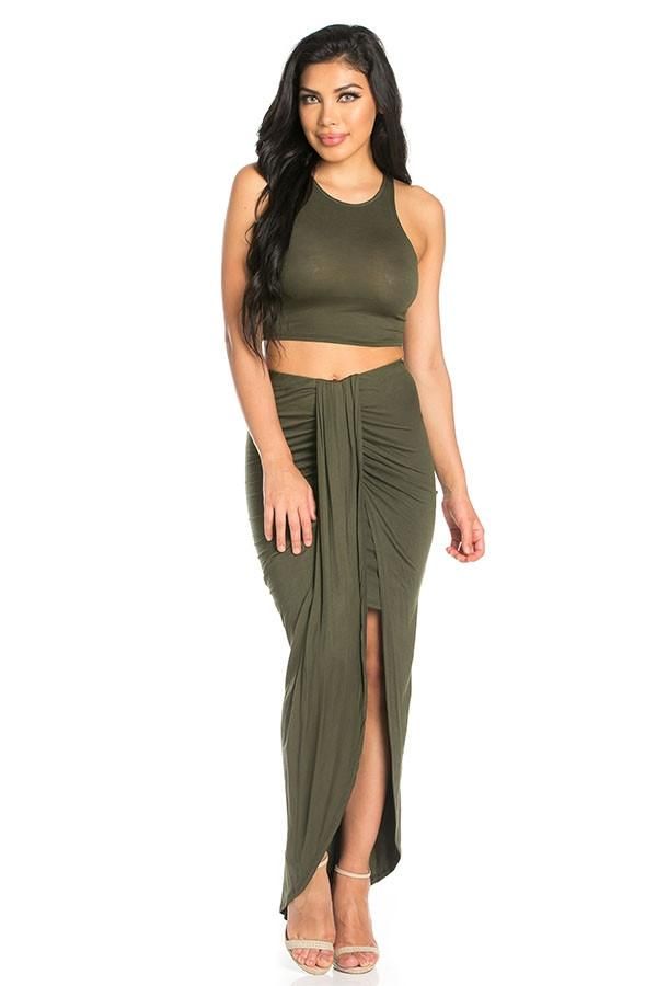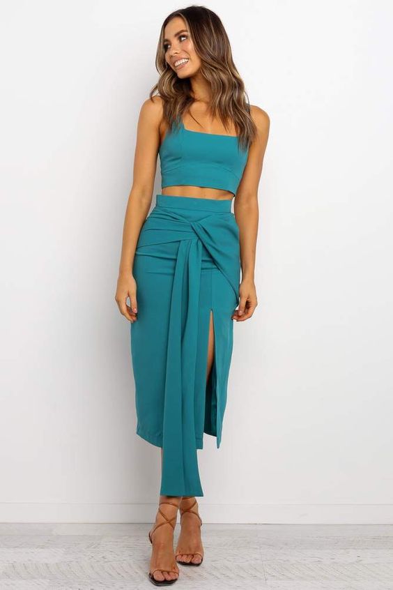 The satin skirt is reimagined in this stunning teal wrap design that exudes a relaxed yet classy vibe. The wrap feature adds a unique touch, allowing for adjustability and comfort, while the side slit adds a hint of sensuality. Paired with a crop top in the same hue, it creates a monochromatic masterpiece that’s both striking and casual.