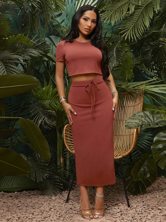 Lilac has emerged as the color of choice for those who prefer a gentle but powerful statement. The midi skirt in this soft hue offers a blend of sophistication and femininity. Paired with a matching crop top, it provides a seamless look that’s both modest and modern. This ensemble is perfect for a brunch or an afternoon stroll, reflecting a casual yet aesthetic appeal.