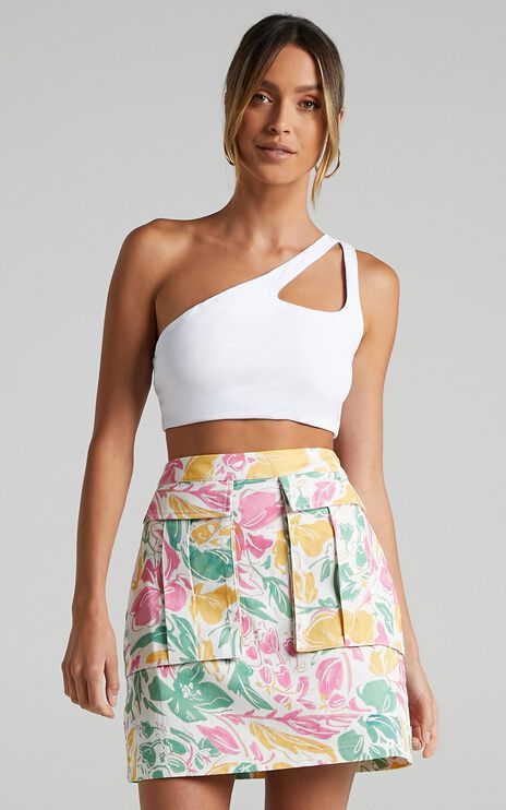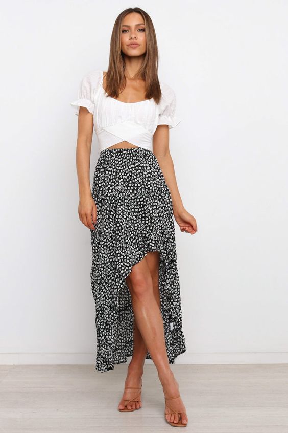 The floral midi skirt with a high-low hemline brings a playful twist to summer wardrobes. The delicate pattern is balanced with a solid white crop top, creating a look that’s breezy and effortless. This skirt is a great choice for a picnic or outdoor festival, embodying a casual and cute vibe that’s very much in vogue for 2024.
