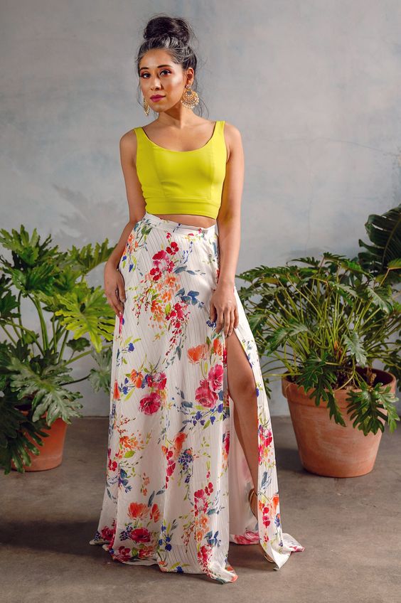 Patterns are taking center stage this season, and the skirt in this image is no exception. The side slit adds an element of surprise and a touch of sensuality to the look. It’s a casual yet bold choice that would suit a day out in the city or a night out with friends. The matching crop top complements the skirt, creating a cohesive and aesthetic ensemble.