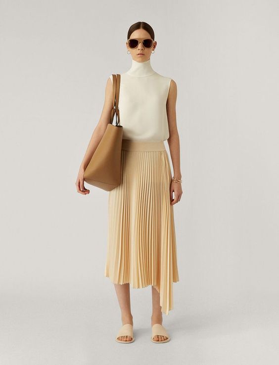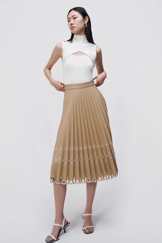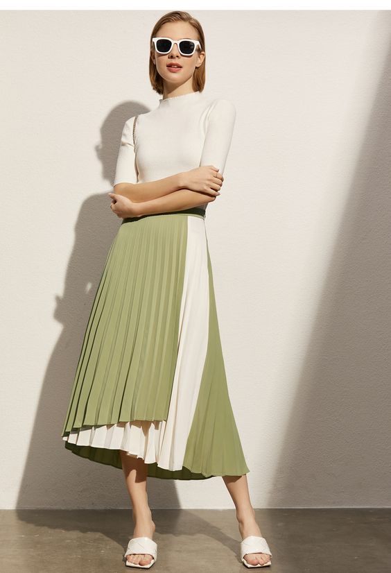 The pleated midi skirt featured here is a testament to the timeless nature of pleats, now reimagined with bold color-blocking. The combination of olive and white gives it a fresh, summer feel, while the movement of the pleats adds dynamism to the look. This skirt is ideal for those who want to make a sophisticated statement without compromising on comfort.