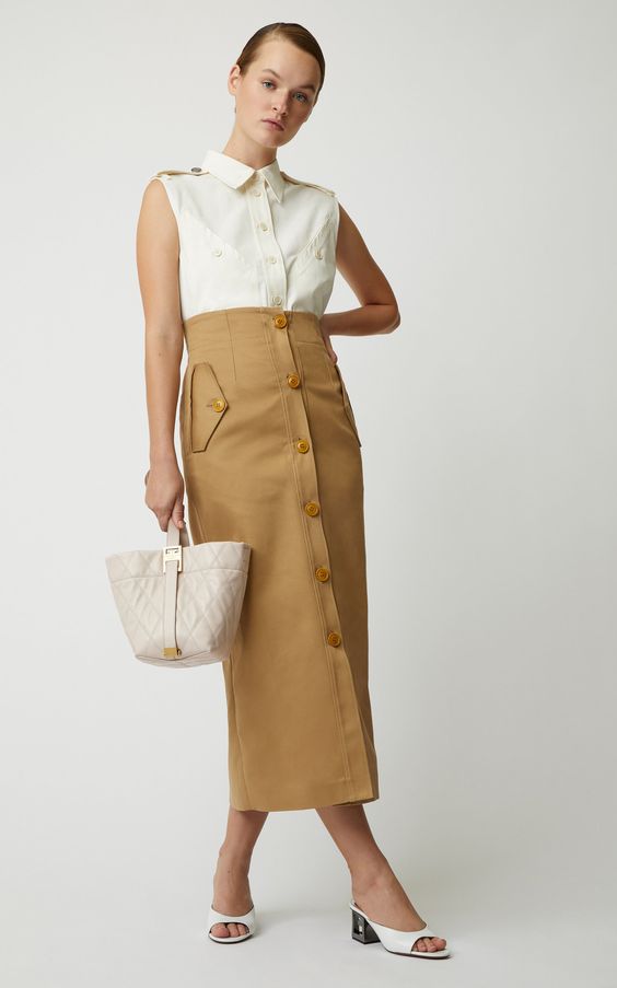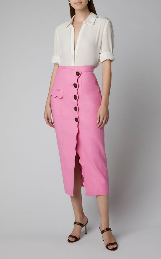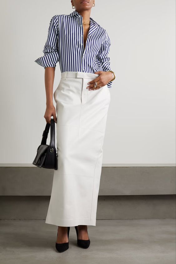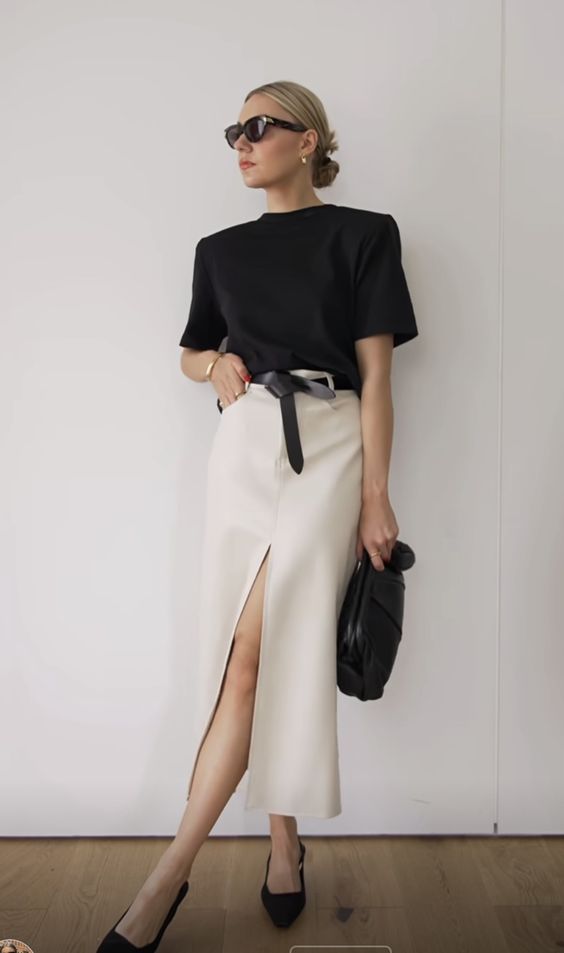 For a classy and professional look, the pencil skirt is a go-to. The one pictured here is particularly striking, with a thigh-high slit that brings an edgy twist to the traditional silhouette. This skirt is a great option for a business meeting or a formal dinner, proving that summer skirt outfits 2024 can be both powerful and stylish.